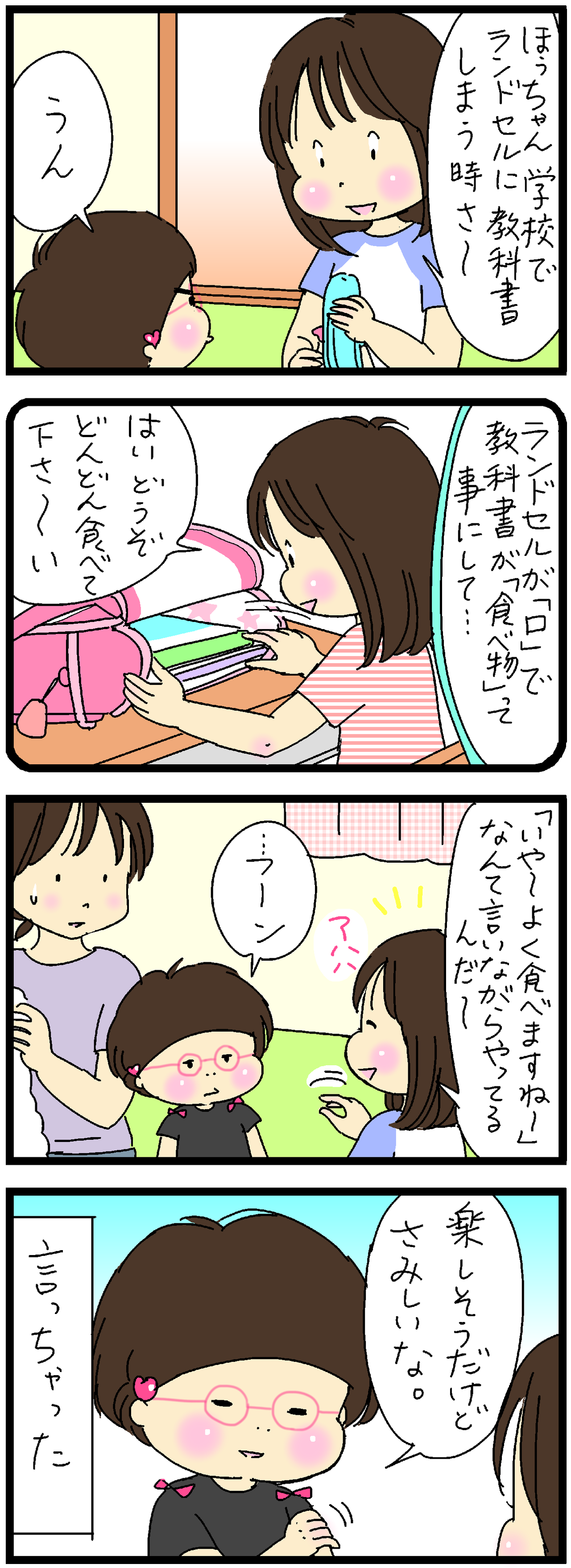 妹の正直すぎる感想 2018年09月09日 来てくださってありがとうございますはじめましての方はこちらから→登場人物紹介長女曰く「なんにもしないよりいいじゃん!」だそうです…↓更新のお知らせが届きます^^↓よろしければ応援クリックお願いします!人気ブログランキング 「姉妹」カテゴリの最新記事 タグ :4コマ漫画絵日記ランドセル < 前の記事次の記事 > コメント コメント一覧 1. 絵壁千花 2018年09月09日 11:24 率直に悲しい現実………! 私も低学年の時そんなような事やっていたのでびくった((((;゚Д゚))))))) いやほんとゆーちゃんおもしろいです 2. なまえがなしこ 2018年09月09日 13:24 辛辣!笑 3. キムさん 2018年09月09日 17:43 ほうちゃんのひとり言かわいいですねー。 私はそういうの出来ない性格の子供だったのですごく羨ましいですね。そのまま変わらないでほしい。 コメントフォーム 名前 コメント 評価する リセット リセット 顔 星 投稿する 情報を記憶