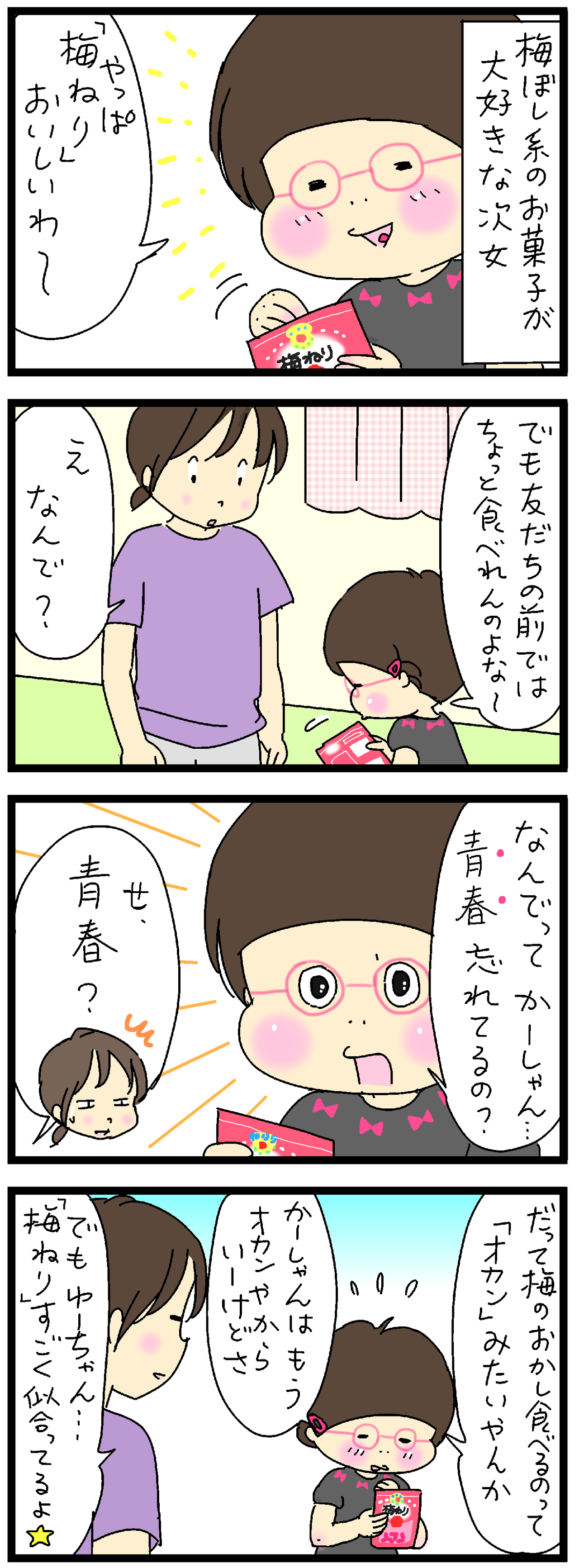 梅ねりと青春 2018年07月18日 来てくださってありがとうございますはじめましての方はこちらから→登場人物紹介オカンの私は誰の前でも梅ねり食べ放題! 「ゆーちゃん(次女)」カテゴリの最新記事 タグ :#4コマ漫画#育児絵日記#絵日記#梅ねり#お菓子 < 前の記事次の記事 > コメント コメント一覧 (7) 1. 麦 2018年07月18日 13:05 毎日楽しく拝見しています😃 ゆーちゃん、梅干し好きなんですね(*´꒳`*) 私は梅干し苦手なのでゆーちゃん凄いと思います(笑)ほうちゃんは何系のお菓子が好きなんですか? 2. めめ 2018年07月18日 13:06 ★Sさん ★絵壁千花さん ★どおりでさん ★imaさん ★ゆきこさん ★かえるさん ★ようちゃんさん コメントありがとうございます! ●柿の種…多分1つずつ口にはさんでいったんでしょうね(^_^;)地味な努力… ●凍ったジュースは外から叩いたらボトルがパキッと割れそうな気がして出来なかったんですが湯煎はいいですね(´∀`) ●病院の先生は本当に大変だなと思います。忙しいのに気を遣っていただいてありがたいです。 ●imaさん!もちろん覚えてます(*´∀`*)移転前からコメントくださってありがとうございます^^ スクリーントーン初めて買ったときはワクワクしました(^-^) ●レターセットやシールは母や妹がたまに昔からとってあるものを持ってきてくれますが子どもたちは躊躇なくバンバン使ってます… ●バラのスクリーントーンを使った次女の絵はちゃおのキャラクターを思いっきり真似してたので今度オリジナルの絵で作成したら載せたいな~と思います(^_^;) ●私は小学生の頃から少女漫画家になるのが夢で、それは叶いませんでしたが今はブログやインスタなどで漫画を描いて見てもらえるようになってよかったなと思います(*´∀`*) 昔は投稿とか持ち込みするしかなかったので…(^_^;) 3. 梅ねり 2018年07月18日 13:40 ゆーちゃん渋い趣味ですね(^_^) 私も梅干し好きです!今も昔も酸っぱい梅干し大好物です(⌯˃̶᷄ ⁻̫ ˂̶᷄⌯) 4. nnnknnnknnnknnnk 2018年07月18日 14:41 梅系のお菓子苦手なんで、食べられるゆーちゃんが羨ましいです! なんか子どもや若いひとが梅のお菓子って食べてたらお洒落じゃないですか??小梅ちゃんって飴とか。。通というかo(^o^)o 私のなかではシナモン、ハーブティー、抹茶に並ぶお洒落感あります! 5. S 2018年07月18日 15:52 ゆーちゃんのヘアスタイル 例の…パッチン留めですね☆めんこい! 梅が好きな人はスマートな体型、というのは、わたしの片寄った経験でしょうか。 わたし?うん、そう、梅が苦手なデブ。 6. jun 2018年07月20日 08:04 似合ってます!笑 7. ローズ 2018年07月20日 08:40 ゆーちゃも気になるお年頃になってきたのですね。可愛い~♪ コメントフォーム 名前 コメント 記事の評価 リセット リセット 顔 星 情報を記憶 コメントを投稿する