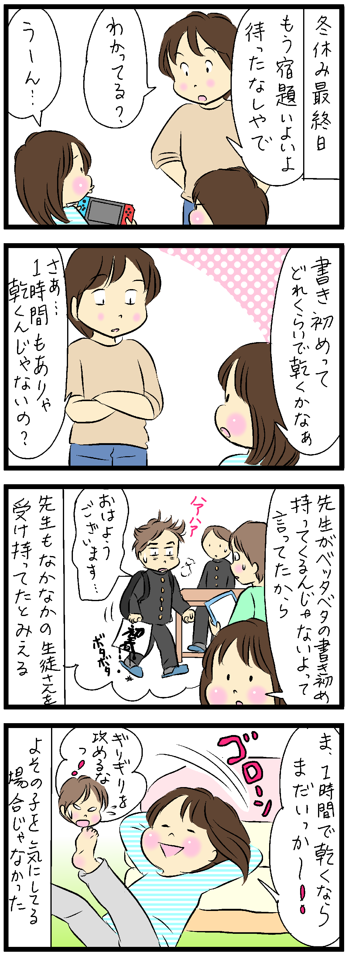 うちは最終日が1月7日で、5日6日は旅行を計画してたのでそれまでにできるだけ宿題をするように言ったのですが、7日にするからと言って旅行の準備ばかりしてました(>_<)