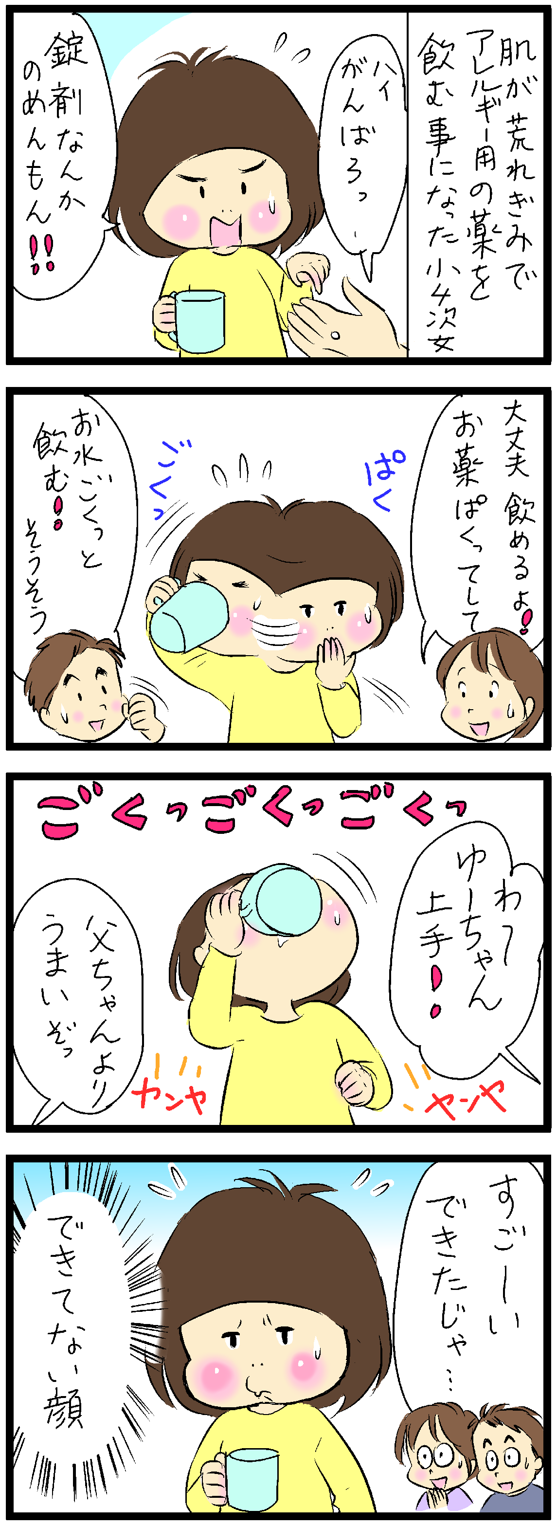 子どもの頃、病院に行った時、先生に、「錠剤飲める?粉にする?あ、これはシロップもあるよ‼️」と言って頂いても、「あ、全滅なんで、錠剤くだいて少しづつ飲ませます。。。」と、母の疲れた顔を思い出します(笑)