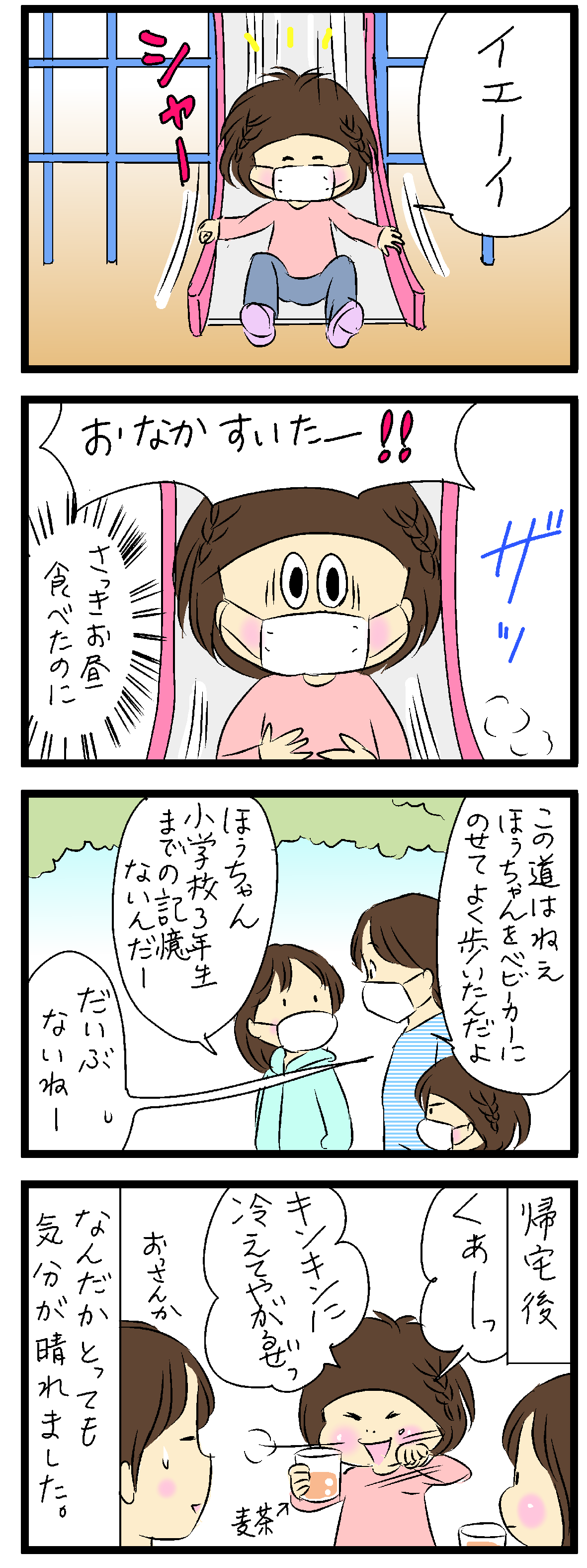 ただ、実家まで20分ほど歩いただけなんですが、ママ、今日はすっごく楽しかった〜♪って言ってました。2カ月家に引きこもり、さらにあと1カ月小学校の休校延長が決定して、完璧な運動不足です。ストレス発散にも、できたら毎日散歩したいですね〜。