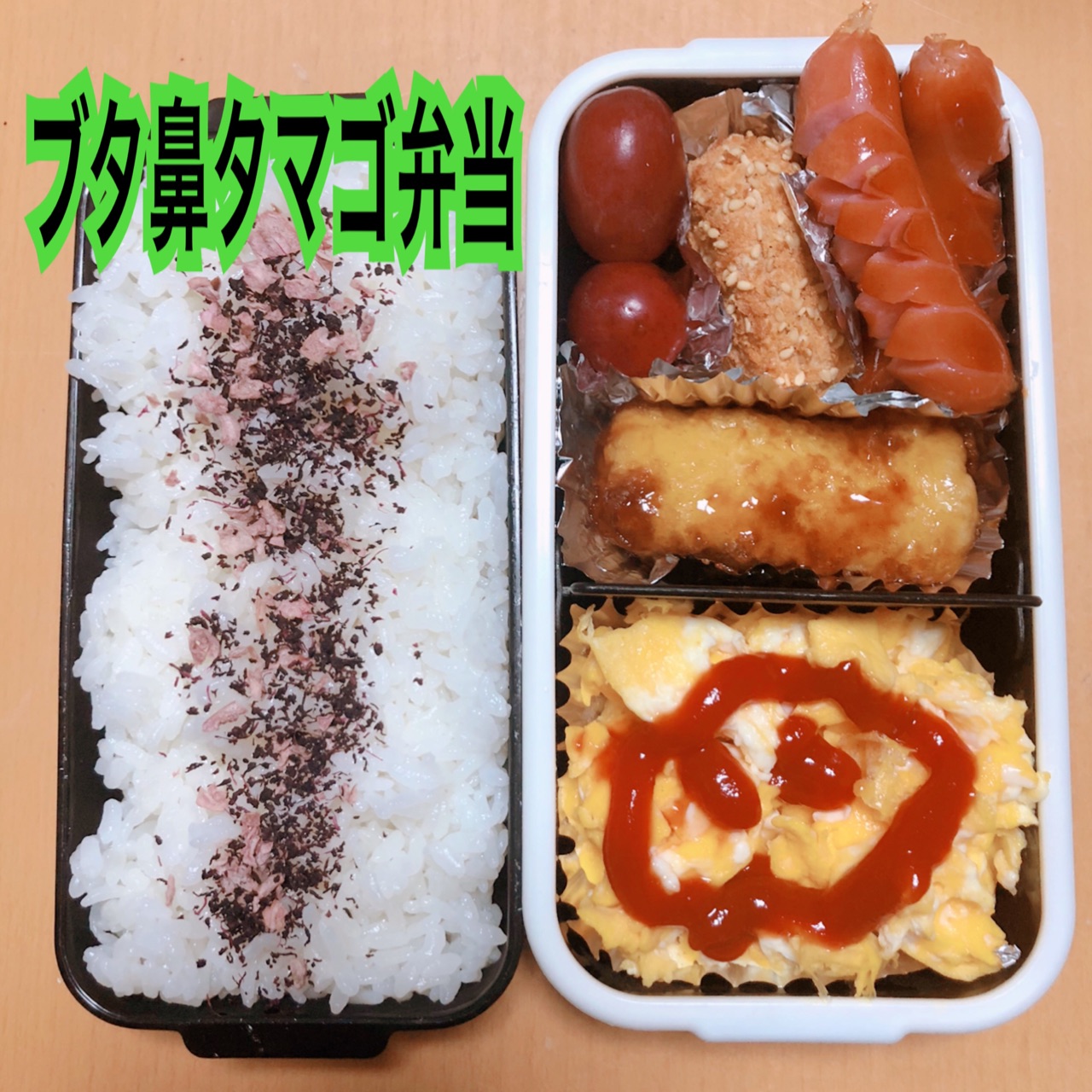 ケチャップの勢いがすごくて口まで描いたら「ハロウィンゾンビ弁当」になりそうだったのでブタ鼻でやめておきました…