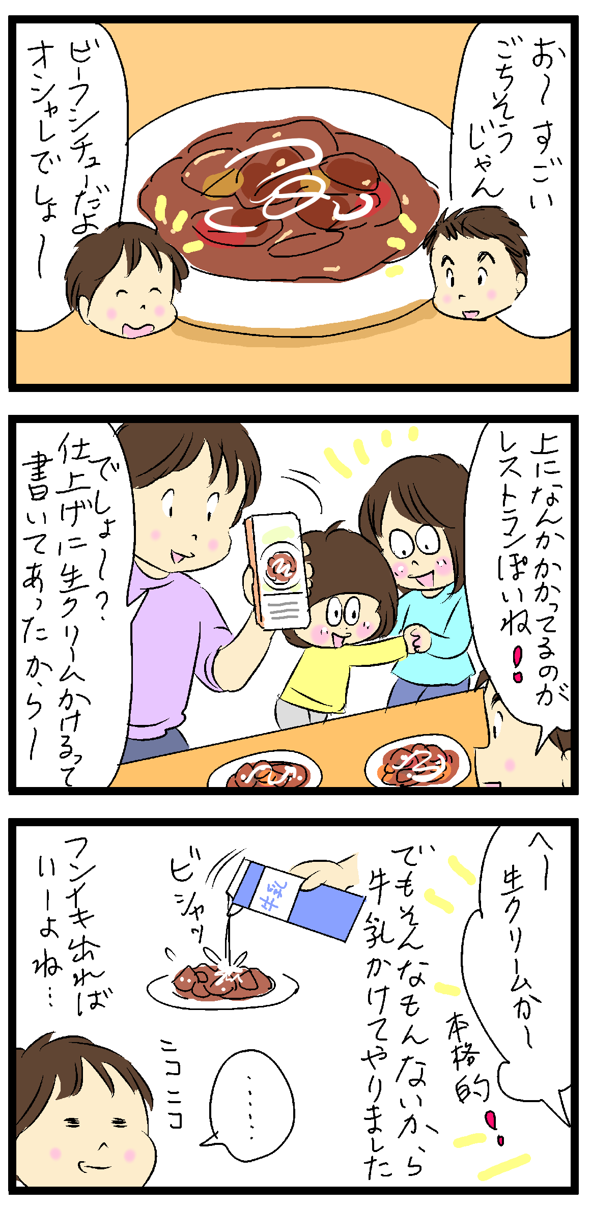 レストランはビーフシチューに仕上げはコーヒーミルクかけてますよ〜!