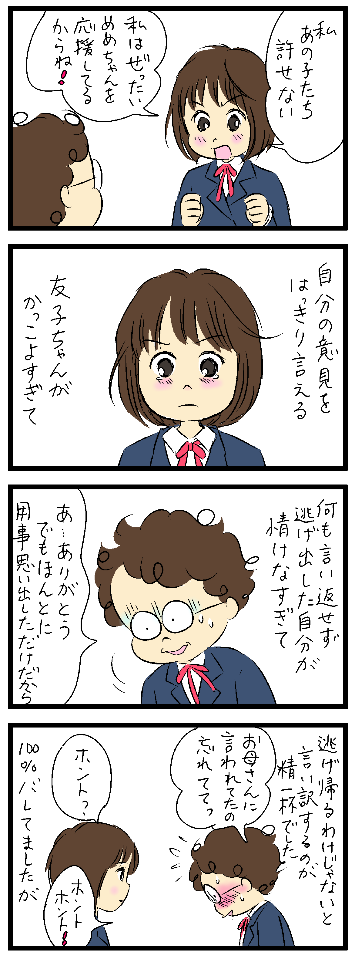 友子ちゃん。。(T_T)なんて素敵なお友達。お母様の絶対に漫画家になれる!も素敵な言葉だったし、、、めめさんは言い返せないかもしれないけど、代わりに言い返して守ってくれる家族やお友達がいる♥️きっとそれって違うことでめめさんが皆に出来ることをしていたからだと思います✨それぞれに得意なことありますもんね☺️