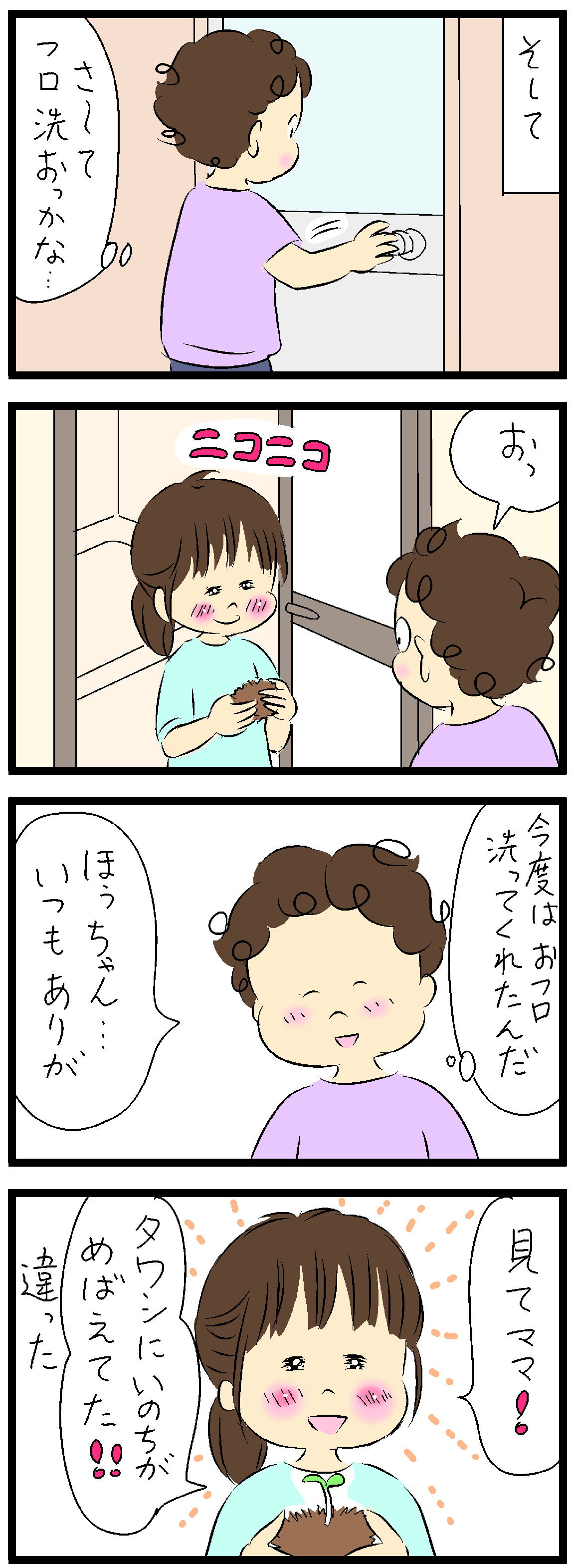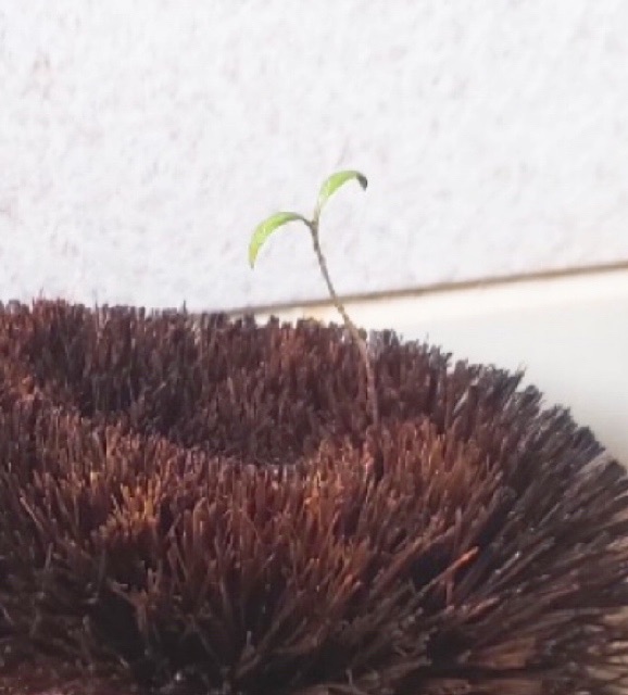そのタワシはもうその子の「大地」にして、大切に育ててあげて何の種だったのか突き止めてみませんか?お風呂掃除には別のタワシを使いましょうよ。