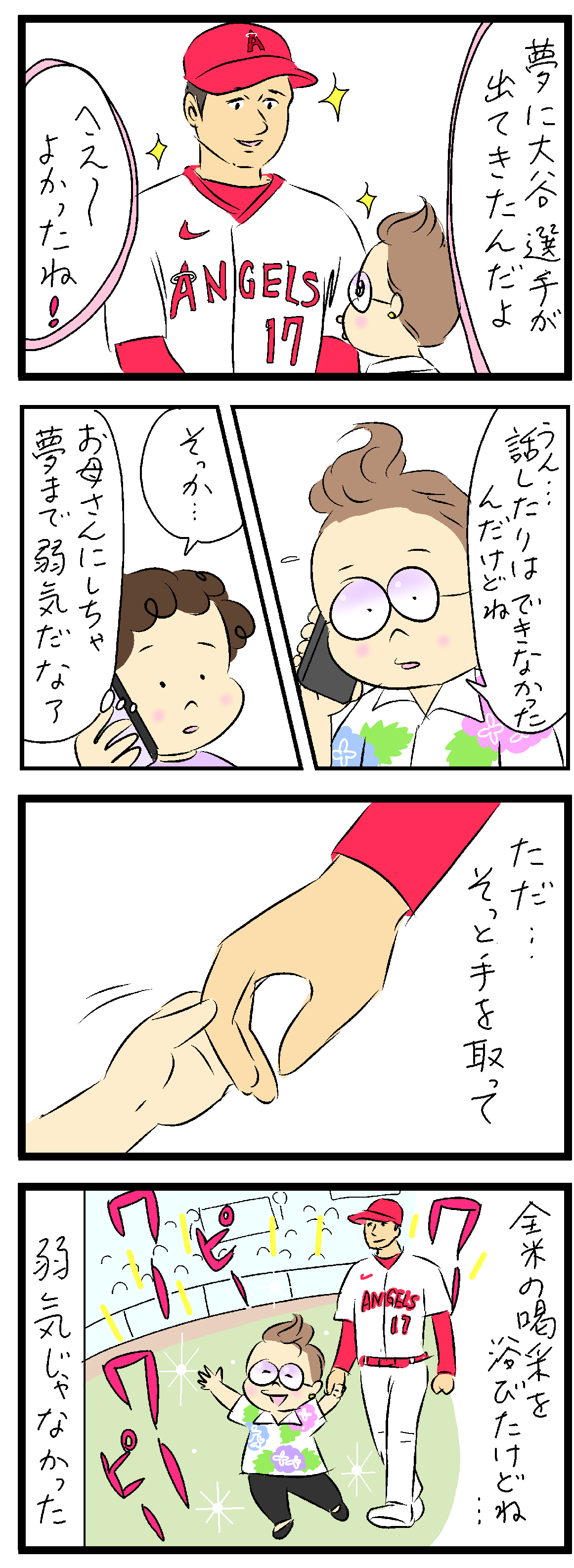 夢の話なのに、大谷選手と話せなかったと聞いて「そっか」と寂しそうにするめめさんもかわいいし、全米から拍手喝采される夢を見るお母さんも豪快健在で嬉しいです。