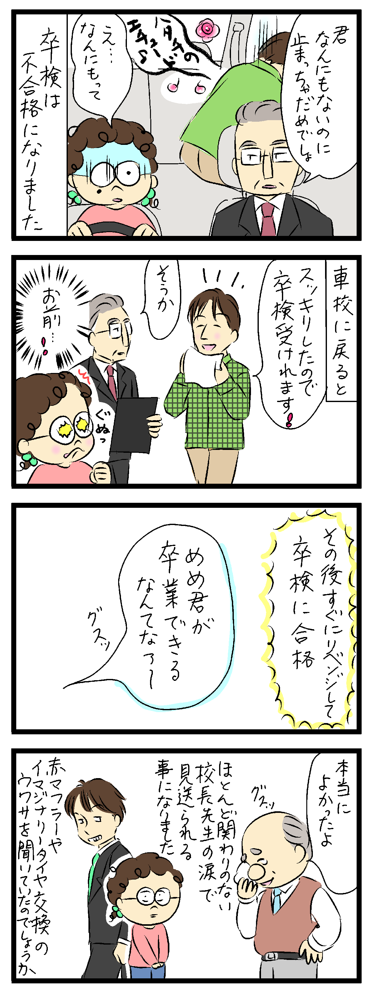 卒検で後ろの人がリバースされるなんて……おいおいって感じですね。その後復活して卒検受けてたなんて。
