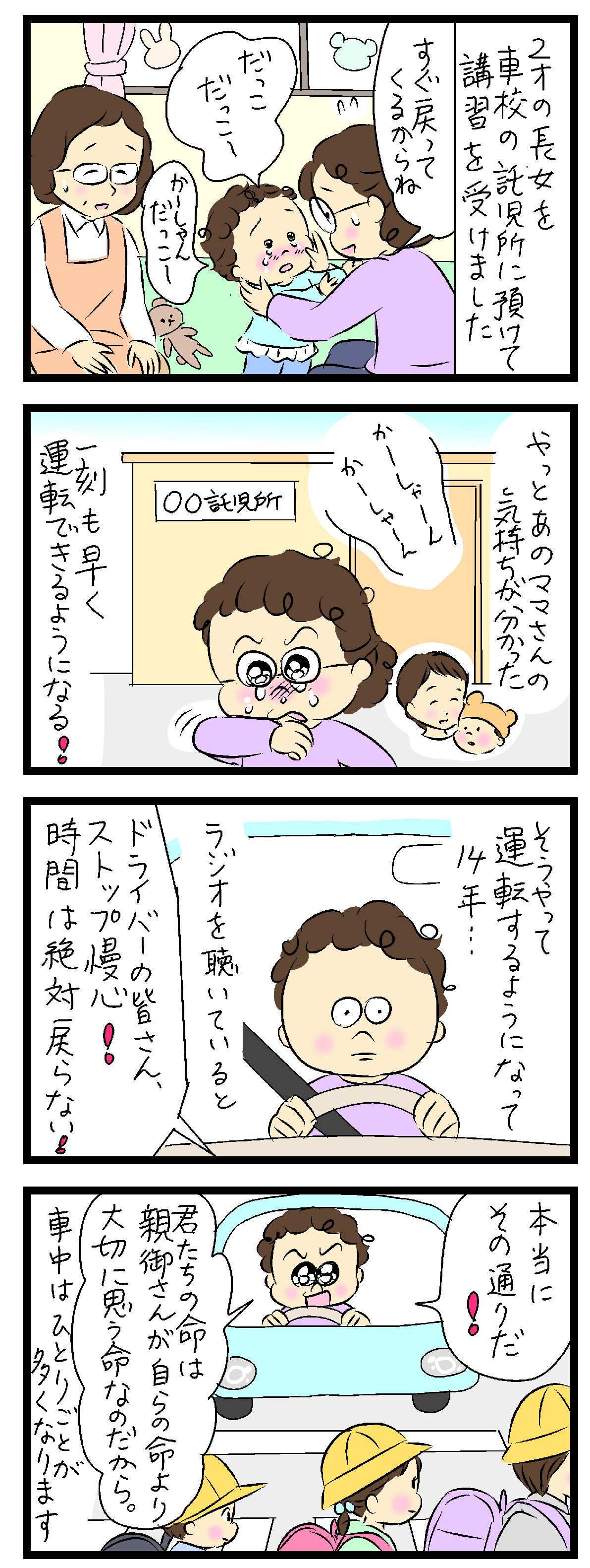 このシリーズの漫画、免許更新時や自動車学校のパンフレットにして配りたいですね。きっと記憶に残ると思います。