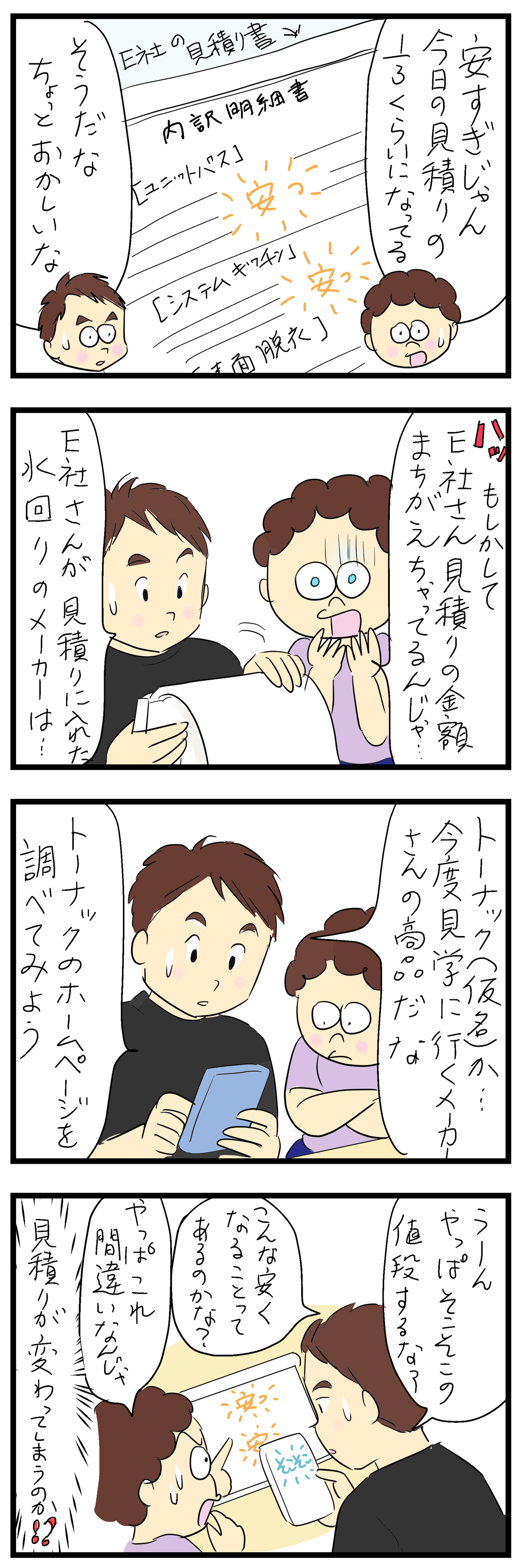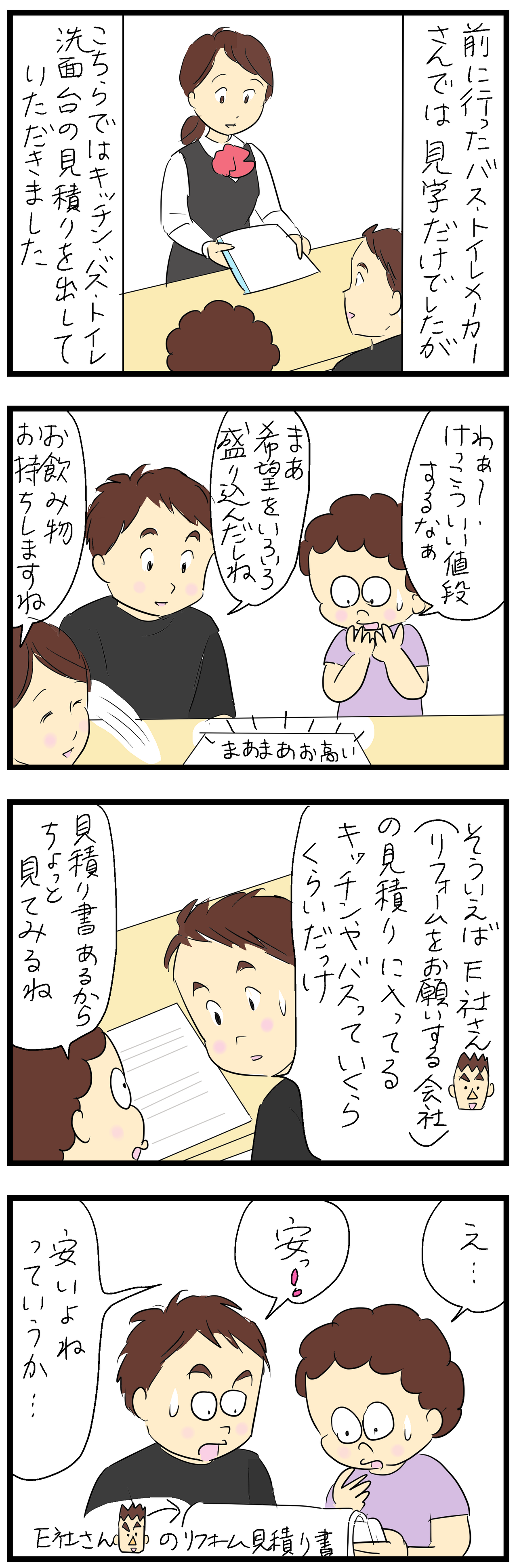 E社さんのリフォーム全体の見積もりは、物価の高騰を考えてもお値打ちかな、とは思いますが決してお安いわけではないので、もし水回りの見積もりが間違いで修正後ドーンと跳ね上がったりしたらえらい事になるのです(;´Д`)