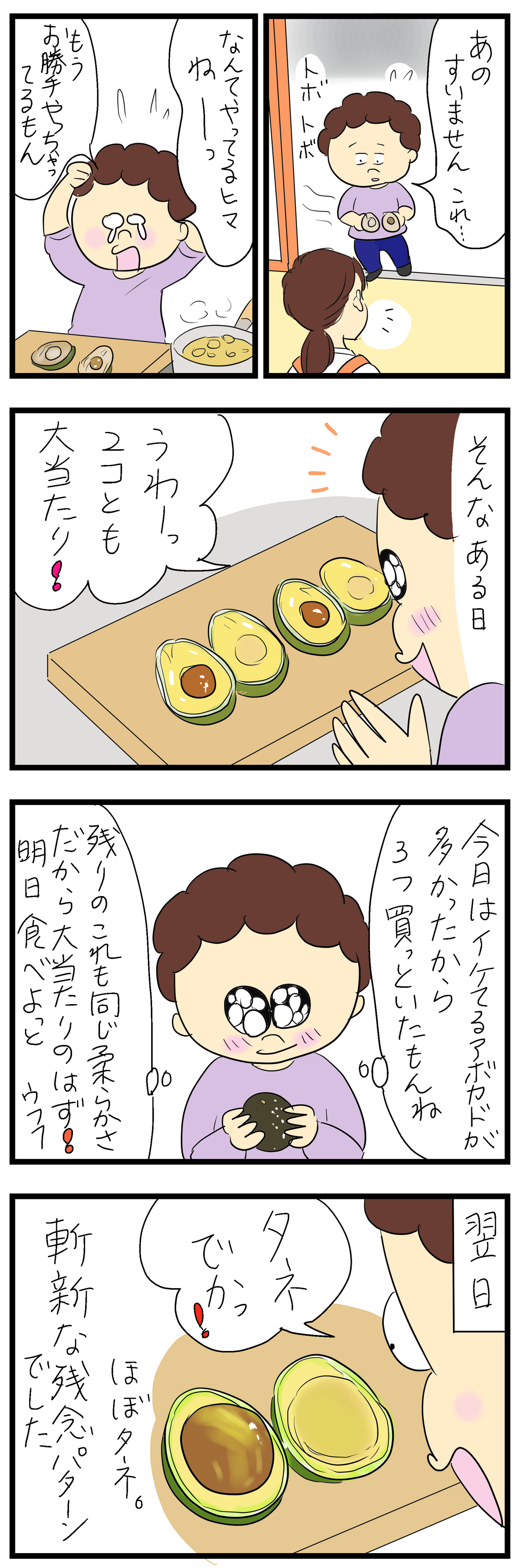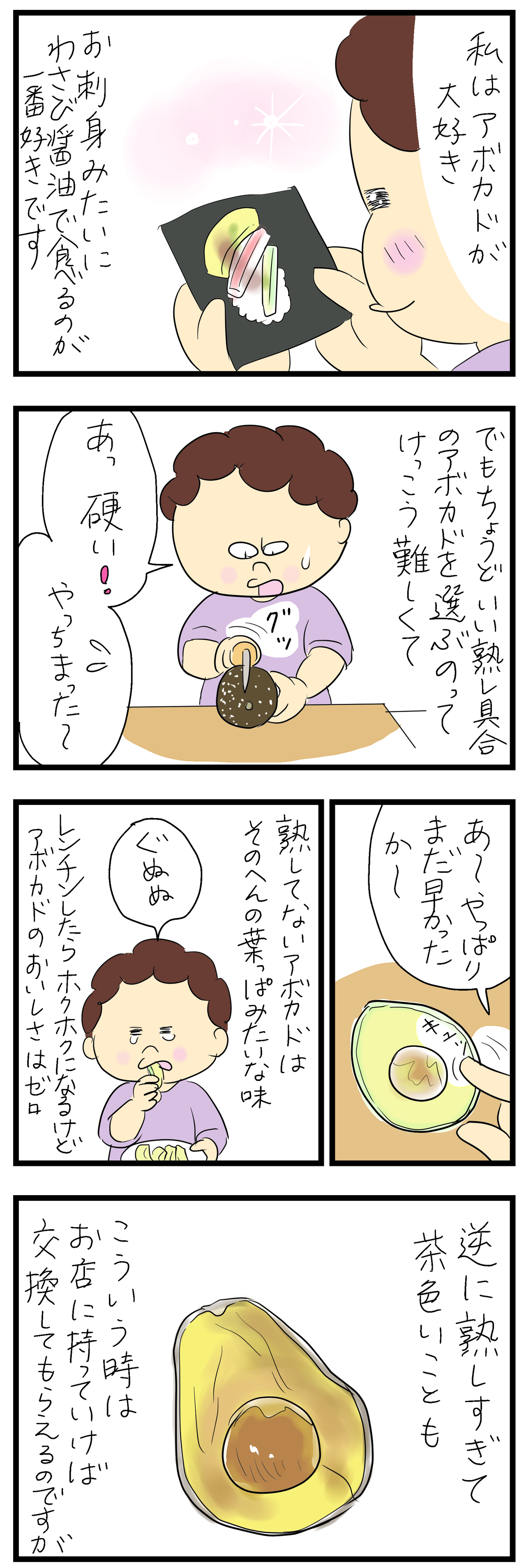 近所にアボカドの半切りが乗ったハンバーグを出すお店があって、アボカドは見分けが難しいのに、毎回こんなに食べごろの状態のを出すなんて(それがプロだと言われればそれまでですが)、どうやっているんだろう?と不思議です
