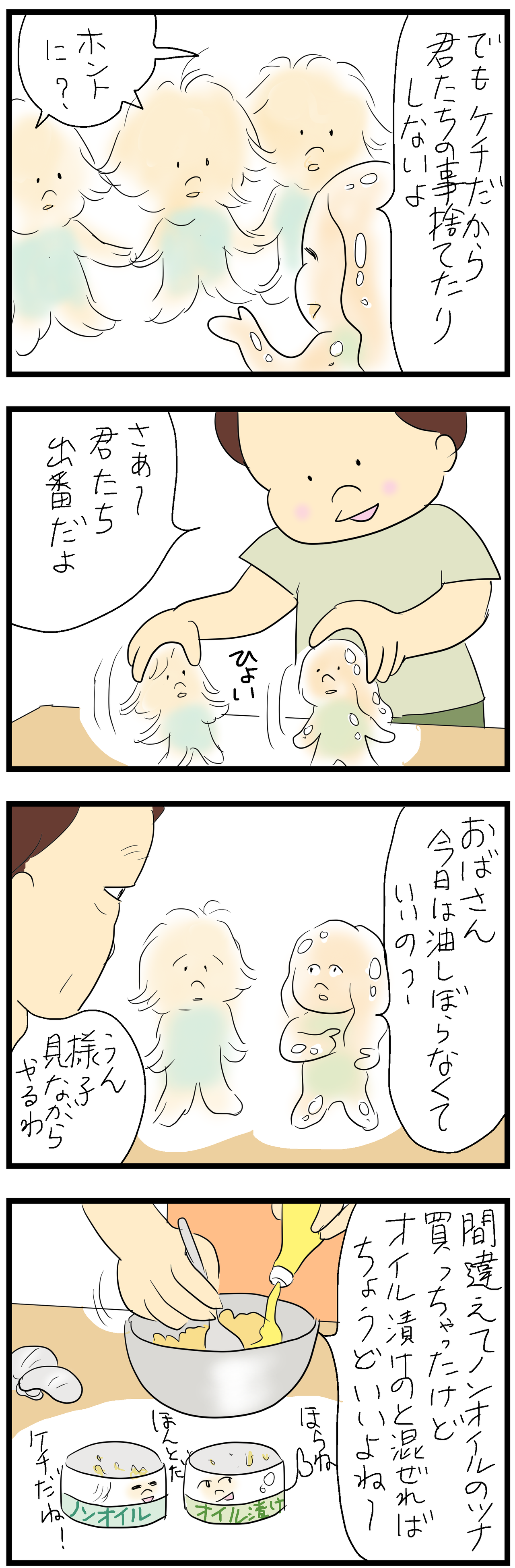 ツナのオイルで炒めるのでオイル無しは