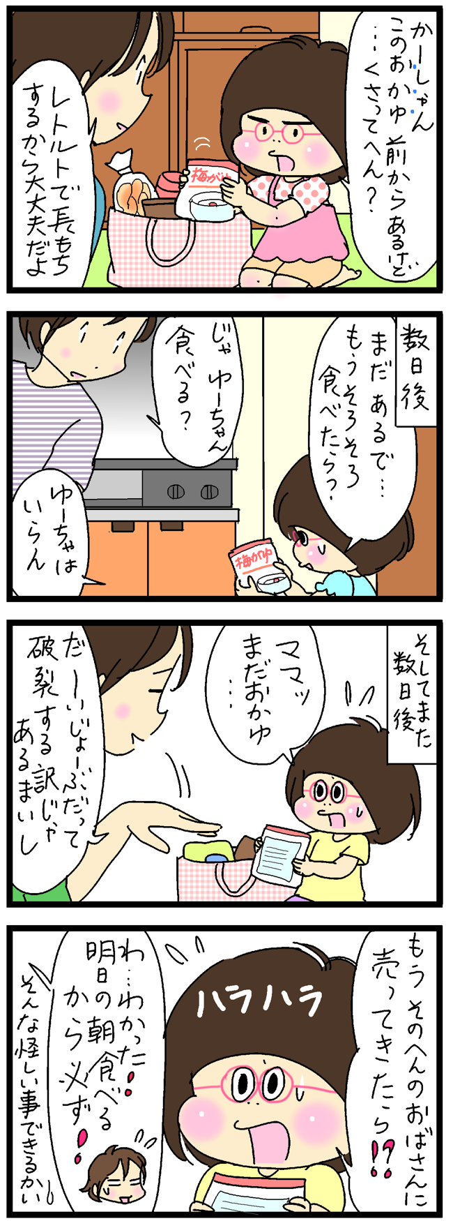 おかゆはいらんかえ~ 2017年06月07日 来てくださってありがとうございます(*´∇`*)はじめましての方はこちらから→登場人物紹介 前記事について。。。 ほんとに牛乳持って飲みながら歩いてたらびっくりしますよね∑(゚Д゚) にほんブログ村にほんブログ村 人気ブログランキング ↑ランキングに参加しております。クリックして頂けるとうれしいです よろしくお願いします^^ 書籍発売中です(*^▽^*) たくあんムスメたち。 天然長女とおっさん系次女の泣き笑いコミックエッセイ (メディアファクトリ... Amazon たくあんムスメたち。 天然長女とおっさん系次女の泣き笑いコミックエッセイ [ 中島めめ ]1,080円楽天 「コミックエッセイ劇場」 ↑タイトルをクリックしていただくと該当ページに飛びます。 書籍の試し読みができます(*^▽^*) よろしくお願い致します。 たくあんムスメたち。ラインスタンプ→こちら 「ゆーちゃん(次女)」カテゴリの最新記事 < 前の記事次の記事 > コメント コメント一覧 (3) 1. Mizuho 2017年06月07日 06:32 笑わせていただきました(笑) 賞味期限を見せて、いつまで大丈夫なことを教えてあげれば良いのに~って思っちゃいました(笑) 2. ローズ 2017年06月07日 07:41 レトルトのパックが怖いのかな?爆発しそうとかゆーちゃは想像してるのかも。 ゆーちゃお菓子なら代わりに食べれたのに残念( ´△`) めめさんはストック用に買われたと思いますが、すぐに食べてあげて下さいね(^^) 3. のはる 2017年06月07日 21:45 日本のレトルト技術の凄さを理解するにはまだちょっと若いですかね~ コメントフォーム 名前 コメント 記事の評価 リセット リセット 顔 星 情報を記憶 コメントを投稿する