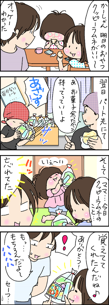クッピーラムネ 2016年05月20日 いつもいいね!やコメントを下さってありがとうございます楽しみに読ませて頂いております。 前記事について。。。次女は虫刺されのあとを見るといつも大騒ぎするので困ってます(^o^;)こんなんでいちいちスイッチ入ってたらこの辺じゃやっていけないと思うんですが・・・ にほんブログ村にほんブログ村 ↑ランキングに参加しております。クリックして頂けるとうれしいですよろしくお願いします^^ 「ほぅちゃん(長女)」カテゴリの最新記事 < 前の記事次の記事 > コメント コメント一覧 (7) 1. まああみ 2016年05月20日 12:08 ラムネ界のパイオニアだとおもっております! ラムネはクッピーラムネ以外受付けないです笑 地元バンザーイ! (名古屋市民じゃないんですけどね) 2. たぬきち 2016年05月20日 13:26 旦那が小さい頃ラムネをコーラにいれ 爆発させた 私ならそんなもったいないこと、できない子供 貧乏だったし そんな事したら 怒られたて 3. むー 2016年05月20日 14:28 入っててナイスっ!! (◍›◡‹◍)♪ 4. ちゃいぽ 2016年05月20日 20:56 こんばんは いつも笑いをこらえる程おもしろくて 楽しませて頂いてマス♪ お子さんがそれぞれ個性があって それぞれ可愛らしいデスね♡ 所で 私のスマホだけだったら申し訳ないんですが 前回から漫画の画素が粗くなった様に思うのですが いかがでしょうか? 設定を変えられたとか? もしくは私のスマホの不具合かもしれません いずれにせよ 私だけだったらすみません! 失礼しました 5. ima 2016年05月21日 16:52 こういうお菓子の詰め合わせに入ってますね♪ セーフ! 夫がクッピーラムネ大好きで夫と知り合ってからよくうちにあります(^^) 娘も大好き♪ 人気のイチゴ味とメロン味だけ入ったやつがあってびっくり! 6. Fhvv 2016年05月21日 21:58 最後のコマでホッとしました(-´∀`-)ちゃいぽさん、私のスマホでは特に画素数は変わらずでしたo(>_<)o設定でしょうか??戻し方分からなくてすみません(´`:)元に戻るとよいですねo(>_<)o 7. ティンカーベル 2016年06月10日 21:15 まさに、奇跡ですね♪ コメントフォーム 名前 コメント 記事の評価 リセット リセット 顔 星 情報を記憶 コメントを投稿する
