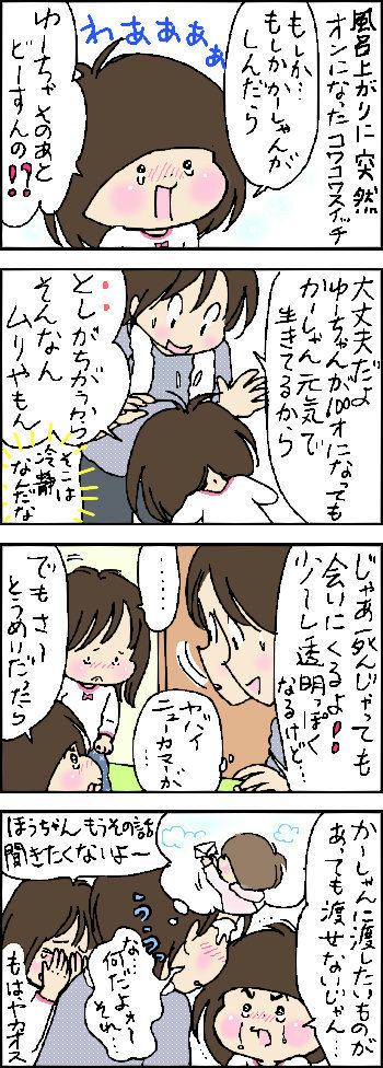 うちは男の子2人、お兄ちゃんは、ママが死んだら、っていう想像するようですが、ばぁちゃんちで暮らす、とか、ママの車は売っちゃおうかな、とか冷静で、寂しいです^^;