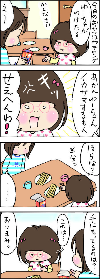 シェア・ポテロング 2015年12月04日 いつもいいね!やコメントを下さってありがとうございます(*^▽^*)楽しみに読ませて頂いております!前記事について。。。そういえば、デカがま口が母に似合うと言った時に横で妹がハクション大魔王のまねしてました!そっちで描けばよかった~あと次女のメガネ、描くの忘れてました~(^▽^;)ちょいちょい忘れてて後で見返して「なんかサッパリした顔してるな~・・・ん?」みたいな(;^_^Aよろしくお願いします^^たくあんムスメたち。ラインスタンプ→こちら 「姉妹」カテゴリの最新記事 < 前の記事次の記事 > コメント コメント一覧 (9) 1. ima 2015年12月04日 06:38 バッチリイカサマ(爆) ほうちゃんもゆーちゃんも「イカサマ」って知ってるんですね! 娘とのはんぶんこは私が一口で残りは娘のです(^_^;) あと、娘が小さいからそんなに食べられないだろうと私の分を多めにとるのが、大きさ・多さの違いがわかるようになって通じなくなってきました(^_^;) 2. ローズ 2015年12月04日 07:12 ゆーちゃんやっぱり多めに分けましたか(*^^*)。おやつは少しでも多くがいいですよね。ほーちゃんと喧嘩にならなかったかな。今度はほーちゃんが分ける番にするといいよ! 3. 桜 2015年12月04日 07:20 すこしでも多く欲しくなるのよねぇ♪( ´θ`)ノ わかるわかる(*^_^*) うんうん と思ってうなづきました♪( ´θ`)ノ 4. なのはな 2015年12月04日 07:46 これは、おつまみ*\(^o^)/* 今朝も笑いをありがとう! でもお嬢さん達は可笑しくも何ともないですねー オヤツのシェアは真剣勝負! 5. 梵 2015年12月04日 09:58 ゆうちゃ… 右手にもポテロング隠し持ってな~い!?(笑) 6. ユリコ 2015年12月04日 11:00 「これは、、、おつまみ。」 この切り返し素晴らしい。 7. オガ 2015年12月04日 14:10 きちんと分けた報酬でしょうか?笑 子供らしくて可愛い♡ 8. みさっぺ 2015年12月04日 15:11 ポテロング、美味しいですよね~ 大人になった今でも、無性に食べたくなって大人買いするときが頻繁にあります…笑 ゆぅちゃんのイカサマしたくなる気持ち分かります笑 9. も~ 2015年12月05日 01:24 おつまみっ!!オヤジですね~(笑) 言い訳が可愛い(///ω///)♪ コメントフォーム 名前 コメント 記事の評価 リセット リセット 顔 星 情報を記憶 コメントを投稿する
