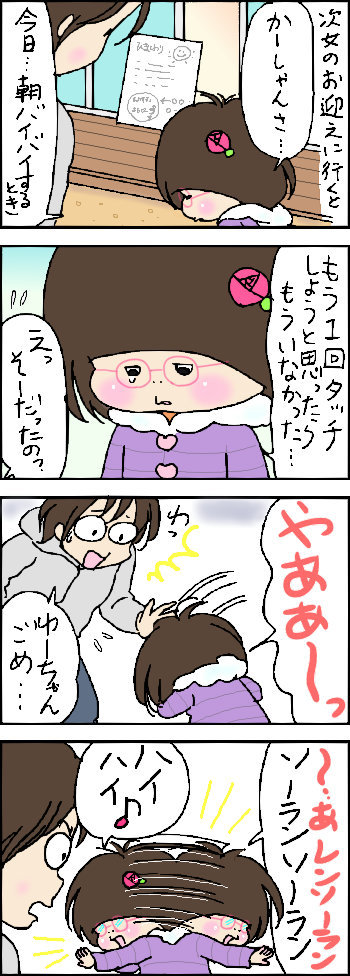 ついていけない 2015年12月02日 いつもいいね!やコメントを下さってありがとうございます(*^▽^*)前記事について。。。次女の頭・・お気遣いありがとうございます~大丈夫でした(^▽^;)何食わぬ顔して3コマ目の状態に戻ってました。過去のブログも読んでくださってありがとうございます!これからもよろしくお願いします(*^o^*) 「ゆーちゃん(次女)」カテゴリの最新記事 < 前の記事次の記事 > コメント コメント一覧 (31) 1. ユリコ 2015年12月02日 10:42 思いもよらぬ展開に、鼻と口からお茶を吹き出しました。 ゆーちゃ、面白すぎます。 今回の記事で確信しました。 めめさんのブログを読んでいる時は、食べたり飲んだりしてはいけません。 気をつけます。 2. niju1004 2015年12月02日 10:52 うちの子と似てるかも、です。 泣きたい気持ちをギャグで飛びしたのかな? 3. Nakky 2015年12月02日 11:07 (`・ω・´)ハイハイ!(笑) 私も、お茶がぐふぉ!!っとなりました。 突然のソーラン節。ゆーちゃん、、、すごすぎる。 4コマなのに、衝撃の結末!!にいつも驚き、にやにやしています。 めめさんのブログは、毎朝の楽しみです。 4. マイケル親方 2015年12月02日 11:24 しんみり…からのソーラン節wwwwww ゆーちゃん、ますます面白く成長してますね(^o^)v ゆーちゃん劇団のミュージカル見てみたい♪ 5. たぬきち 2015年12月02日 11:24 恥ずかしいを かくしての ですがビックリあはは でした 6. yuki 2015年12月02日 11:25 照れ隠しですね(笑) 私も、そんな子供でした(^^ゞ 7. シュナ 2015年12月02日 12:00 みなさん記事を読むときの注意点について体験を通してお気づきになられたようで仲間が増えて嬉しいです。 ちなみに私はそれも忘れて親子丼が飛び散る寸前でした。 ネタの入手と日々の心労はセットで受け入れないといけないんですね・・ めめさんのみならずお嬢さんたちにも感謝です。 8. ♡苺姫♡ 2015年12月02日 12:07 ゆーちゃんファンです! ほんとに発言や行動が可愛すぎて 声出して笑ってしまいました(♡´▽`♡) 9. ローズ 2015年12月02日 12:09 めめさんがホロリときたときには、ゆーちゃん!!って感じですね。ゆーちゃんの照れ隠しですねо(ж>▽<)y ☆ ツンデレゆーちゃんが大人になるの楽しみ(‐^▽^‐) 10. kazutanv 2015年12月02日 12:29 爆笑~。車の中で味噌汁混ぜながら‥。声出してわらっちゃった!!! 11. るみゑ 2015年12月02日 12:34 アハハ^^面白い(笑)! 12. りよこ 2015年12月02日 12:36 あはは!(笑) ほんまは悲しかったのか、でも急に歌いたくなったのか、はたまた最初からかーしゃんを驚かせようとしたのか…(笑) ゆーちゃんめっちゃかわいーし、面白い! かーしゃんやとーしゃん、お姉ちゃまみんな優しくて仲良しやからこんなかわいいお子様になるんでしょうねぇ。 13. ふわネコ 2015年12月02日 12:39 切替の速さ!!笑 ゆうちゃん、大物になりますよね~!! 14. ポッケ 2015年12月02日 12:58 相変わらず٩(๑>∀<๑)۶面白すぎです。 15. さなぎ 2015年12月02日 13:06 あまりに面白くてついコメント失礼します!! 爆笑しました~(笑) いつも笑いと癒しをありがとうございます(*´ω`*) 16. えっきー(゚▽゚)/ 2015年12月02日 13:12 ずっと読ませていただいていましたが 初めてのコメント失礼します! 凄まじくおもしろい! これからも笑わせてください笑 17. こなっチャン 2015年12月02日 13:19 ゆーちゃん素敵すぎる(笑) 吹いてしまいました!! 18. きっちょむ 2015年12月02日 13:27 おお!そうきたか!! ふり幅が大きすぎて、耳キ~~~ンなるわっ 19. おばちゃん 2015年12月02日 13:42 なんじゃそら!!って声でました。 方言で 何それ!ってこと。 突っ込みどころ満載(笑) 20. COCO✳︎ 2015年12月02日 13:48 お昼休憩中に吹き出しました!笑 ゆーちゃん、仕事の合間の癒しをありがとう( ⸝⸝⸝⁼̴́⌄⁼̴̀⸝⸝⸝) 21. あすかな 2015年12月02日 14:01 ゆーちゃんの唐突な感じ素敵(笑) 思わずイライラも消えちゃう感じ! うちの娘はイヤイヤ期真っ只中の2歳と 我が道を行く10ヶ月なんですが ゆーちゃんみたいなユーモアたっぷりの 女の子に育って欲しいな(*¯ω¯*) これからも笑いと感動のblog楽しみにしてます╰(*´︶`*)╯♡ 22. ひぃ 2015年12月02日 14:08 今日は悲しかったしんみりのお話ね~、って思いきや!!(笑) まさかの!! 思わず吹き出してしまいました! 23. みゆき 2015年12月02日 14:13 急に照れが出て、ごまかしたのかもですね、笑! かわいすぎる(^^) 24. むー 2015年12月02日 18:04 ゆうちゃん… 天才ですね!( • ̀ω ⁃᷄)✧キリッ 私も旦那さんにやってみよう!笑 25. ima 2015年12月02日 18:57 あはは(笑) なんやそれ!(爆) さみしそうな表情にドキッとしましたが、ゆーちゃんが怒ったり泣いてなくてよかった(^^) 26. オガ 2015年12月02日 19:06 やん♡超可愛い!!! からの爆笑ですわ~笑 もう大好きすぎます!! 27. いちゃこ 2015年12月02日 20:10 カワイイ~♡♡♡ そして笑いに変える関西魂♡ 28. はこ 2015年12月02日 21:18 きっとゆーちゃの照れ隠しですね! ゆーちゃらしくて、カワイイ~。 29. まる 2015年12月02日 22:30 ゆうちゃん、最初から仕組んでいたのかなぁ?と思ったけど、他の方のコメントみて、あ、照れ