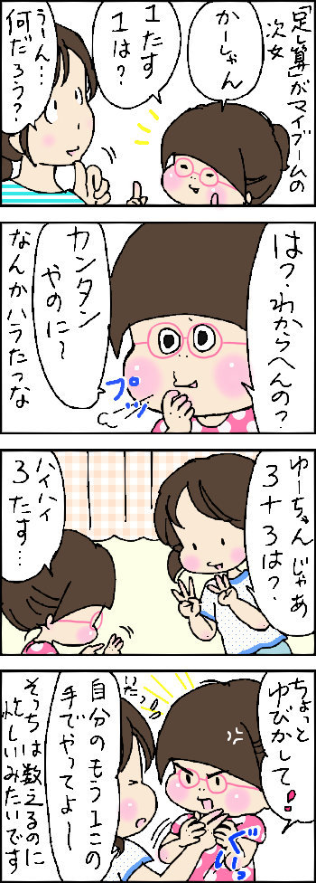 レッツ足し算! 2015年07月14日 育児絵日記 ブログランキングへにほんブログ村 ↑ランキングに参加しました。クリックして頂けるとうれしいです 「姉妹」カテゴリの最新記事 < 前の記事次の記事 > コメント コメント一覧 (3) 1. ローズ 2015年07月14日 06:56 賢いなぁ。片手は確認用にいるのですね。 ほぅちゃんの指使って賢いなぁ(^^)。 2. 梵 2015年07月14日 11:22 ゆーちゃん頑張って(^-^)/ 3. いろえんぴつ 2015年07月14日 13:54 2コマ目のゆーちゃんの顔!(笑) コメントフォーム 名前 コメント 記事の評価 リセット リセット 顔 星 情報を記憶 コメントを投稿する