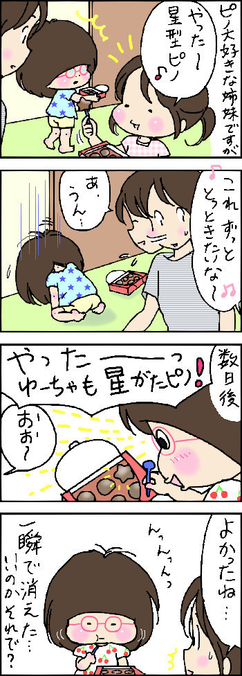 星のピノ 2015年07月12日 育児絵日記 ブログランキングへにほんブログ村 ↑ランキングに参加しました。クリックして頂けるとうれしいです 「姉妹」カテゴリの最新記事 < 前の記事次の記事 > コメント コメント一覧 (8) 1. ⊂(栗-ω-鼠)⊃‐RiS‐ 2015年07月12日 05:05 とりあえず星形が出ればそれでイィのね(*´艸`*)ァハ♪ 2. aema-09 2015年07月12日 05:37 私のブロクの読者になっていただけませんか? 3. Yu 2015年07月12日 10:21 初めまして! 過去ログも全部見てほぅちゃんとゆーちゃんと大ファンです! ゆーちゃんのついつい不安になってしまうことに共感したり、ほぅちゃんのメルヘンになってしまう行動に共感したり… 一児の母でありながらついつい子供の目線で見てしまいます。 そんな子供達の何気ない日常をよく見ていらっしゃり、いつも適切な言葉をかけてらっしゃるめめさんは素晴らしいお母さんだな~見習いたいなといつも思ってます! お仕事に家事育児大変でしょうが毎日更新楽しみにしてます! ゆーちゃんにもちゃんと星ピノが出て良かった~笑 4. たぬきち 2015年07月12日 10:50 幸運をとりこみましたね その方がいいかも 5. ima 2015年07月12日 11:44 ゆうちゃんのも出てよかった♪\(^o^)/ たとえ一瞬でも確かにあった! 6. 梵 2015年07月12日 14:56 星でもソッコー食べます(笑) ゆーちゃん大好き‼ 7. いろえんぴつ 2015年07月12日 17:38 あります、あります。 姉妹でも全然性格違うの! 私は、ゆーちゃんの潔さを見習います! 8. ローズ 2015年07月13日 07:11 二人とも星ピノでて良かったね(*^^*) ゆーちゃんはすぐ食べてしまう派なのですね(^^)。 コメントフォーム 名前 コメント 記事の評価 リセット リセット 顔 星 情報を記憶 コメントを投稿する