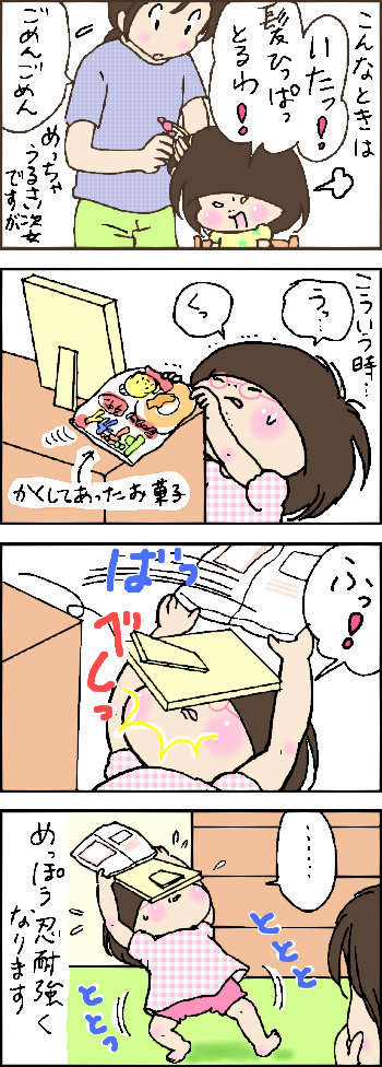 自己責任です 2015年06月19日 育児絵日記 ブログランキングへにほんブログ村 ↑ランキングに参加しました。クリックして頂けるとうれしいです 「ゆーちゃん(次女)」カテゴリの最新記事 < 前の記事次の記事 > コメント コメント一覧 (18) 1. ゆゆゆゆい! 2015年06月19日 09:50 いつも楽しくブログ拝見しております♪ ゆーちゃんは将来大物になりそうな予感… 2. アロー 2015年06月19日 11:03 素敵(^o^)。 3. こもも 2015年06月19日 11:22 毎日楽しみに見ています! 見れば見るほど、姉の子供達に二人ともそっくりで、会いたくなってしまいます(*^^*) たまに出る方言も、実は同じです(笑) 私もそんな可愛い姉妹が欲しいな~(*´ω`*) 4. きゃら 2015年06月19日 11:32 毎日笑かしてくれますねー(笑) 授乳の合間合間にすごく癒されます! いつもありがとう、ゆーちゃん!w 5. たぬきち 2015年06月19日 12:23 子供て どんなにかくしても おやつとか さがしだす天才ですよね 何度か とられたことか(笑) 6. kazutanv 2015年06月19日 13:17 いつもblog楽しみにしてます! 7. chomo 2015年06月19日 20:45 どでかいチキンラーメン、おいしいですよね(^^) めめさんの細かい書き込みが、いちいちツボです笑 8. にこまるまま 2015年06月19日 22:20 うちの次女がいる!と思うくらいそっくりです。どこでうちの次女のことみてました?と聞きたいくらい(^o^) 違いは、髪を結ぶのが、姉ちゃんな事くらいです。(私が不器用なので)いつも、せっかく結んでるのに~、だって痛いのに~と、喧嘩になってます。でも、結んでもらいたいから、お願いして、また喧嘩になってます。 9. ローズ 2015年06月23日 09:00 痛みは感じないものですよね(‐^▽^‐) ゆーちゃんお菓子無事食べれましたか? 10. めめ 2015年06月30日 19:55 >ゆゆゆゆい!さん ありがとうございます(*^o^*)将来好きなように生きていきそうな気がします・・ 11. めめ 2015年06月30日 19:57 >アローさん 都合が悪い時は無口になる子です(~_~;) 12. めめ 2015年07月02日 22:11 >こももさん ありがとうございます(*^o^*)二人ともそっくりとは・・お姉様、頑張りましょうねと思いました~ 13. めめ 2015年07月03日 22:43 >きゃらさん お疲れ様です(*^o^*)いつも見て下さってありがとうございますo(^_^)o 14. めめ 2015年07月03日 22:45 >たぬきちさん 大体隠すとこ決まってきちゃいますよね~あんまり隠し場所に凝るとこっちが忘れるという(;^_^A 15. めめ 2015年07月03日 22:46 >kazutanvさん とても励みになります!ありがとうございます(*^o^*) 16. めめ 2015年07月03日 22:48 >chomoさん これ細かいのと違って散らかりにくくていいですよね~(^。^)まあ散らかしますけど(;^_^A 17. めめ 2015年07月04日 23:03 >にこまるままさん お姉ちゃんすごいですね(*^▽^*) でも私も下手なので保育園で先生が結び直してくれてる率高しです(;^_^A 18. めめ 2015年07月05日 17:36 >ローズさん 自分が仕留めた獲物のような態度でえばりながら姉と食べてました(^▽^;) コメントフォーム 名前 コメント 記事の評価 リセット リセット 顔 星 情報を記憶 コメントを投稿する