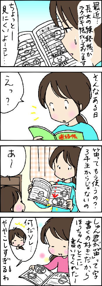 なぞのメッセージ 2015年03月26日 育児絵日記 ブログランキングへにほんブログ村 ↑ランキングに参加しました。クリックして頂けるとうれしいです 「ほぅちゃん(長女)」カテゴリの最新記事 < 前の記事次の記事 > コメント コメント一覧 (8) 1. hica 2015年03月26日 06:44 ほうちゃん♡♡♡ 恋してるのかな?♡♡♡ かわいいー♡♡♡ 2. ローズ 2015年03月26日 08:51 情報満載の連絡帳ですね(^^) ほーちゃんらしくほのぼのとしたエピソードですね!! 私の家は弟が字を書き始めた頃の私の悪口を書いたノートが出てきました。 喧嘩した後に書いたのでしょう。口に出したら泣かされるから・・・。 3. えむ 2015年03月26日 11:11 こんにちは。 昨日、こちらのブログにふらりとやってきて、すっかり虜になってしまいました。 ほうちゃんがうちの娘に似ていて、ほっこりします♪ ゆーちゃんも面白い!! 子供って自由でいいですね。 過去の記事、すべてにコメントしたいくらいです^^ 4. ココヤス 2015年03月26日 12:45 こんにちは☆ 連絡帳懐かしい~!! 私は幼稚園のころの連絡帳がこうなってましたね~♪ 毎日楽しく拝見しております~☆ 5. めめ 2015年03月30日 16:18 >hicaさん たぶん・・何も考えてないかも(^▽^;) いつかそういう話してくれる日がくるといいな~( ´艸`) 6. めめ 2015年03月30日 16:22 >ローズさん そんなノートが出て来たんですね(^▽^;)想像するとなんかかわいいな~と思いました・・ 7. めめ 2015年03月30日 16:25 >えむさん ありがとうございます(o^^o) 過去記事ちょっと書きなぐりチックで(今もか(-。-;))見にくいと思いますがこれからもよろしくお願いします 8. めめ 2015年03月30日 16:30 >ココヤスさん ありがとうございます(o^^o) 連絡帳を入れる袋が今は指定のジッパーケースですが私の頃は親の手作りで、かなり個性的なのを持たされていた記憶があります(^o^;) コメントフォーム 名前 コメント 記事の評価 リセット リセット 顔 星 情報を記憶 コメントを投稿する