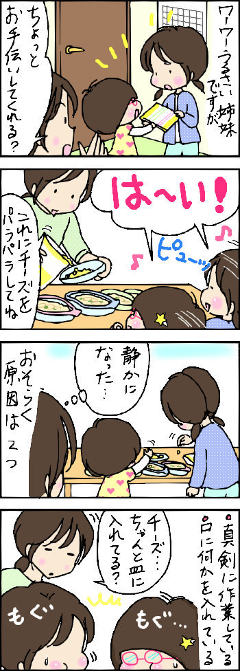静かな理由 2015年03月25日 育児絵日記 ブログランキングへにほんブログ村 ↑ランキングに参加しました。クリックして頂けるとうれしいです 「姉妹」カテゴリの最新記事 < 前の記事次の記事 > コメント コメント一覧 (9) 1. 赤男 2015年03月25日 06:26 フフフ…つまみ食いですかww 子供ってやりますよね~ 2. ローズ 2015年03月25日 07:00 ゆーちゃん風に言えば、味見してたんだよ~(*^^*)かな。つまみながら作るの楽しいですね(*^^*)。未だにやっちゃいます。作るだけでお腹一杯になることも。 3. たぬきち 2015年03月25日 08:58 美味しいて わかってるからつまむんだよね 4. にこまるまま 2015年03月25日 18:48 下の子が静かなのは、口の中に、ものが入ってるときと、ウトウトしてるときくらいです。後なぜか、私の車の後部座席に乗っているときです。 私が何か作っていても、味見してあげる!と、寄ってきます。 5. ゆりちゃん@女子大生 2015年03月30日 10:37 ゆりゆりと言います(。・Д・)ゞゆっくり読んでみました~♪(・ω<)せっかくなので読者になりますね♪^^ 6. めめ 2015年03月30日 16:03 >赤男さん 私もやりつつ作る感じなんであまり偉そうなこと言えないんですけど(^◇^;) 7. めめ 2015年03月30日 16:05 >ローズさん 私も(^▽^;)ゆで卵でタルタルソース作ってたら味見しすぎて胸やけが・・ なにやってんだか(;´▽`A`` 8. めめ 2015年03月30日 16:08 >たぬきちさん 次女がとくにチーズ大好きなんですよね~(^◇^;) 9. めめ 2015年03月30日 16:11 >にこまるままさん してあげるっていいますよね(^▽^;)うちはその後感想言ってくれないので味見の意味が( °д°) コメントフォーム 名前 コメント 記事の評価 リセット リセット 顔 星 情報を記憶 コメントを投稿する