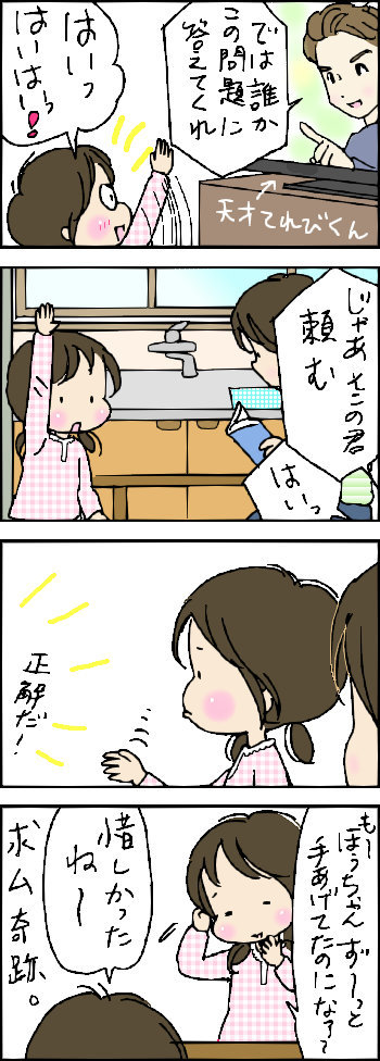 ハイハイッ! 2015年03月23日 育児絵日記 ブログランキングへにほんブログ村 ↑ランキングに参加しました。クリックして頂けるとうれしいです 「ほぅちゃん(長女)」カテゴリの最新記事 < 前の記事次の記事 > コメント コメント一覧 (14) 1. みどり 2015年03月23日 07:20 初めてコメントいたします。 ほ、ほ、ほんとに?! ほうちゃん!君ってやつぁ!! わたしが男だったらお嫁さんにしたいっ。・゜・(ノД`)・゜・。 2. ローズ 2015年03月23日 08:58 テレビのお兄さんほーちゃんを指名してくれるといいですね(^^) (スタジオに参加した子供が答えてたんですよね・・・。) 3. TamaEvo9 2015年03月23日 09:17 何とも言えず残念感を表してますね。 大人はあまりしませんが、5歳の娘は注意されるたびに下唇が飛び出してます(笑) 4. マツコEx 2015年03月23日 10:09 ほぅちゃ~ん♡なんてカワイイねんな~。 いつか、ほぅちゃんに答えさせてくれたら良いね♪ 5. たぬきち 2015年03月23日 13:20 残念 めげないでね! 6. green-sakura29 2015年03月23日 17:32 わたしも幼い時、おかあさんといっしょの体操のお姉さんと二人きりで体操やダンスをするコーナーで、緊張して固まる3歳児を見て、「わたしならうまくできるのになあ…なんで順番来ないのかなぁ…」と真剣に思っていたことを思い出しました(*^^*) そして最近娘も「おにいさんたちいつ保育園に遊びに来てくれるんかなあ…」とポツリと呟き、みんな一緒だねと微笑ましく思いました。 7. ピカケツ 2015年03月23日 19:09 はじめてコメントします! 最近読みはじめて、すっかりはまってしまいました。 面白くてかわいくて楽しいです。 たまに自分の小さい頃や、母のことを思い出したりして温かい気持ちにもなります。 これからも楽しみにしています。 8. めめ 2015年03月28日 14:49 >みどりさん 頭では分かってるんでしょうけど夢中になると混乱するみたいです(;^_^A 9. めめ 2015年03月28日 23:24 >ローズさん てれび戦士とかいう子供たちが出演していて視聴者参加型の番組なんですが、そこまでリアルに参加するのは難しいですよね(;^_^A 10. めめ 2015年03月28日 23:26 >TamaEvo9さん あの表情は本能的なもんなんでしょうかね~?ついやりたくなるのかな(^◇^;) 11. めめ 2015年03月28日 23:30 >マツコExさん 呼ばれたら普通に答えるんじゃないかってくらい入り込んでましたf^_^; 12. めめ 2015年03月28日 23:34 >たぬきちさん また次見るときも手上げそうです´д` ; 13. めめ 2015年03月28日 23:37 >green-sakura29さん 細かいこと考えずに自然にテレビの世界に入れちゃうんですよね(*^^*)楽しそうかも・・ 14. めめ 2015年03月28日 23:40 >ピカケツさん ありがとうございます(≧∇≦)楽しんで読んで頂けると思うとすごく嬉しいです!これからもほそぼそとやって行きますのでよろしくお願いします コメントフォーム 名前 コメント 記事の評価 リセット リセット 顔 星 情報を記憶 コメントを投稿する