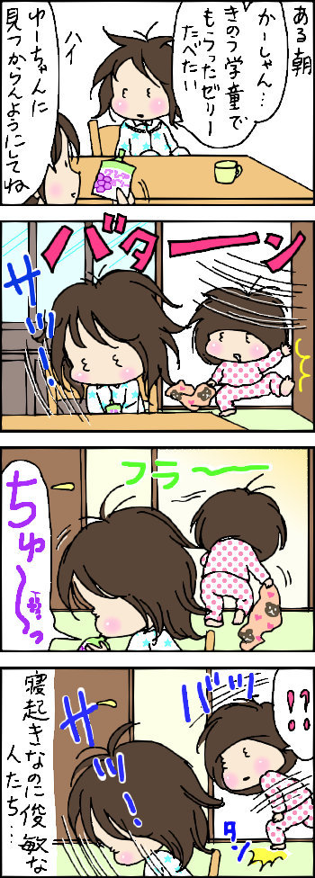 サバイバル・モーニング 2015年02月02日 読者様の好きな時間に新着記事がチェックできるようになりました!↓よろしければ応援クリックお願いします!人気ブログランキングにほんブログ村 「姉妹」カテゴリの最新記事 < 前の記事次の記事 > コメント コメント一覧 (16) 1. sgpk26 2015年02月02日 06:56 朝のその俊敏さ私も会得したい…(笑) 起きたあともたもたしちゃう癖がいまだに夫婦揃ってぬけてません(笑) 2. むらこ 2015年02月02日 07:59 この二人の関係好きやわ~♡ タオルぎゃわいいし♡ いつも細かいとこまで書き込まれて尊敬しまっす! 3. プリン 2015年02月02日 08:38 3の目が かわゆい! (笑) のび太君ですねぇ ゼリーは無事? 見つからずでしたか? 4. ローズ 2015年02月02日 08:54 ゆーちゃんぶどうの香りがしたのかな? 勘のするどいタイプなのかもしれませんね。 ほーちゃんもドキドキしながら飲んだのでしょうね(^^)。味わえなくて残念だけど・・・。 見つかったら大騒ぎだったでしょうね~。 5. シュナ 2015年02月02日 08:54 通勤電車なのに堪えきれずに声が出てしまいました・・ はなかっぱの次くらいに匹敵する作品でしょうか。 タオルもそうですが、私はセリフの中のブドウに芸の細かさを感じました。 6. ハッピーすまいる 2015年02月02日 09:08 かわいい~です! 寝起きで、その動きとは、さすがです(笑) しかも、いつもながら描写がわかりやすくて、すぐ入り込んじゃいます! 7. たまち 2015年02月02日 17:20 ふふふ!! わかります~。 ウチも、菓子袋の 開けるかしゃかしゃ音で 姉妹&旦那までハッ!! と振り返ります(≧▽≦) 8. anna 2015年02月02日 22:03 兄弟あるあるですね(笑) うちにも6歳、4歳、2歳の子供たちがいるのですが、まさにこのようなことがありました(^^) 9. めめ 2015年02月03日 06:22 >sgpk26さん 私も休みの日なんかひどいですがそれが本来の姿です(;^_^A 10. めめ 2015年02月03日 06:25 >むらこさん いえいえ気に入ったとこだけしつこく描いて家具とかは超なげやりになっております´д` ; 11. めめ 2015年02月03日 06:27 >プリンさん 見つからず飲み切ってました(^▽^;)っていうか妹は床でタオルかぶって二度寝してました(´Д` ) 12. めめ 2015年02月03日 06:28 >ローズさん ちゅーって音に反応したようですが、ぶどう臭もかなりしてたので鼻も反応してたかもしれません(^◇^;) 13. めめ 2015年02月03日 06:31 >シュナさん あはは(^▽^;)あのぶどうですが最初描いたときなんかブキミな感じになっちゃってちょっと描き直したんですよ~ 14. めめ 2015年02月03日 11:17 >ハッピーすまいるさん 寝起きでもライバル意識ははたらいてるんですよね~(^▽^;) 15. めめ 2015年02月03日 11:18 >たまちさん しゃかしゃか音は私も振り返ってしまいます(^◇^;)反射的に・・ 16. めめ 2015年02月03日 11:21 >annaさん ぼーっとしてるようでお互いの存在しっかり意識してるんですよね(^▽^;) コメントフォーム 名前 コメント 記事の評価 リセット リセット 顔 星 情報を記憶 コメントを投稿する