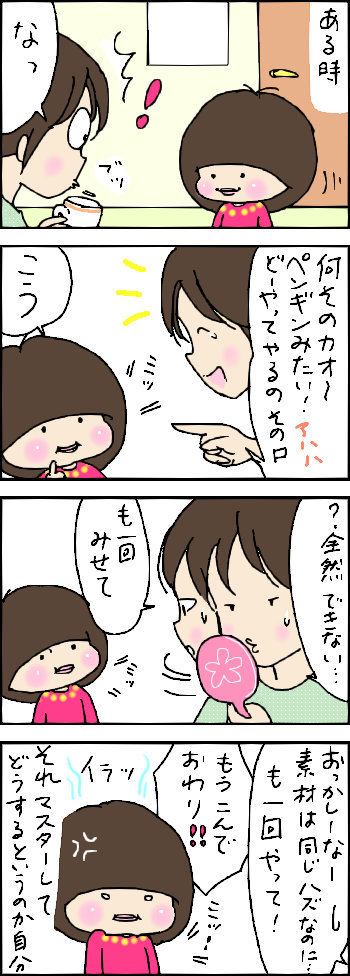 ミッ! 2014年11月05日 「ゆーちゃん(次女)」カテゴリの最新記事 < 前の記事次の記事 > コメント コメント一覧 (4) 1. シュナ 2014年11月06日 08:39 出勤電車の中でこのブログを読んでいると、隣の人から「この人、クスクス笑ってるんだけど、何?頭おかしいの?」という視線を感じます。 かなり心構えをしないと危険です・・ ちなみにマスターはできましたか? 2. めめ 2014年11月06日 18:06 >シュナさん いえなかなか上手くできなくて・・ってまだやる気なのか私(-。-; シュナさんいつも見て下さってありがとうございます☆彡励みになります! 3. うみ 2019年09月16日 17:46 どんな口? ペンギン?? あひるではないんですよね?? うぅ…、どんな口か気になる😑 4. めめ 2019年09月16日 22:48 >>3 イラストのペンギンの口みたいな感じです(^^)ほっぺたにめり込んでるからそう見えるみたいです。 コメントフォーム 名前 コメント 記事の評価 リセット リセット 顔 星 情報を記憶 コメントを投稿する