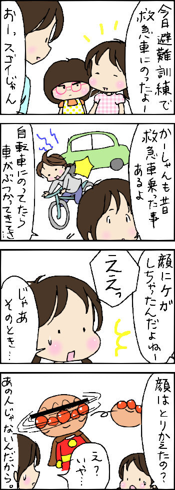 救急車の思い出 2014年07月16日 にほんブログ村 4コマ ブログランキングへ↑ランキングに参加しました。クリックして頂けるとうれしいです 「お母さん(私)」カテゴリの最新記事 < 前の記事次の記事 > コメント コメント一覧 (6) 1. シュナ 2014年07月16日 06:45 さすがの発想ですね。 私も焼き直してもらいたいです。 2. ネコおやじ 2014年07月16日 12:55 相変わらずナイスなシュールさで笑えます・・・www アンパンマンてwww 3. ペンギン 2014年07月16日 22:49 ナイスツッコミ! 確かにアンパンマンを見なれた子はそう思うかも。 4. めめ 2014年07月17日 09:03 >シュナさん 私もです!好きな女優さんの顔でお願いしたいです(*^▽^*) 5. めめ 2014年07月17日 09:05 >ネコおやじさん 取り替えられるんなら別のもっといいやつにしたい(;´Д`)ノアンパンマンて欲がないと思います・・・ 6. めめ 2014年07月17日 09:07 >ペンギンさん しかし交換シーンで完全に首もげてるから他キャラなら死んでますよね(°д°;) コメントフォーム 名前 コメント 記事の評価 リセット リセット 顔 星 情報を記憶 コメントを投稿する