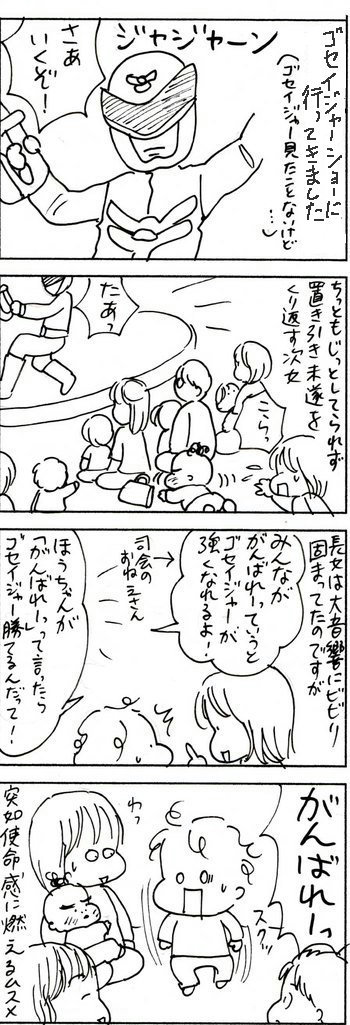 ゴセイジャーショー 2010年10月30日 「姉妹」カテゴリの最新記事 < 前の記事次の記事 > コメント コメント一覧 (4) 1. りたむ 2010年10月30日 17:58 置き引き未遂wの次女ちゃんも、使命感に燃えるほぅちゃんも、めっちゃカワユスヾ(@^(∞)^@)ノ 鼻息が荒くなりましたw ほうちゃんの『みろりのひと』発言の“ろ”にメロメロ≧(´▽`)≦ 2. めめ 2010年10月30日 21:30 >りたむさん こわがってたくせにナデナデしてもらって内心うれしかったんですよね(^_^;)単純な子です・・・(;^_^A 3. ぼっつぇ 2010年10月30日 21:58 みろりのひとと握手できなくて残念だったね(笑) 使命感に燃えちゃうところがかわいいなあ。 悪役も案外いいやつですね。 小さい子がいるとショー見るのも大変そーだなあ。置き引きとか(笑) うちは上の子がファンなので行きたいですが、それ考えると行けないんですよね・・・ 4. めめ 2010年11月01日 10:52 >ぼっつぇさん ほんとにどこ行っても下の子追い回してる記憶しか残らないです(;´Д`)ノはやく意思の疎通ができるようになりたい・・なっても言う事聞きゃしませんが┐( ̄ヘ ̄)┌ コメントフォーム 名前 コメント 記事の評価 リセット リセット 顔 星 情報を記憶 コメントを投稿する